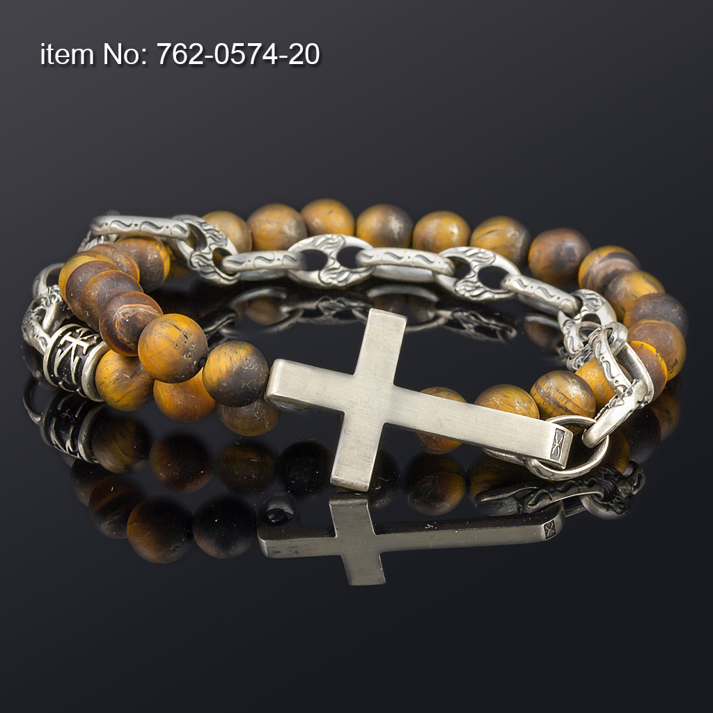 Sterling silver double wrap bracelet with cross, chain and beads