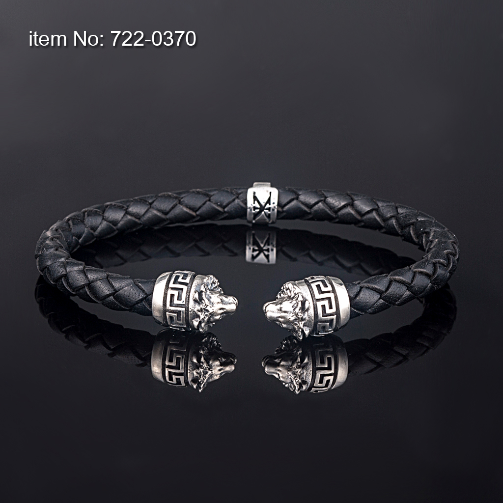 925° Ασημενιο Βραχιόλι με μοτιφ Λιοντάρι & Μέανδρο & γνήσιο πλεκτό δέρμα 6mm