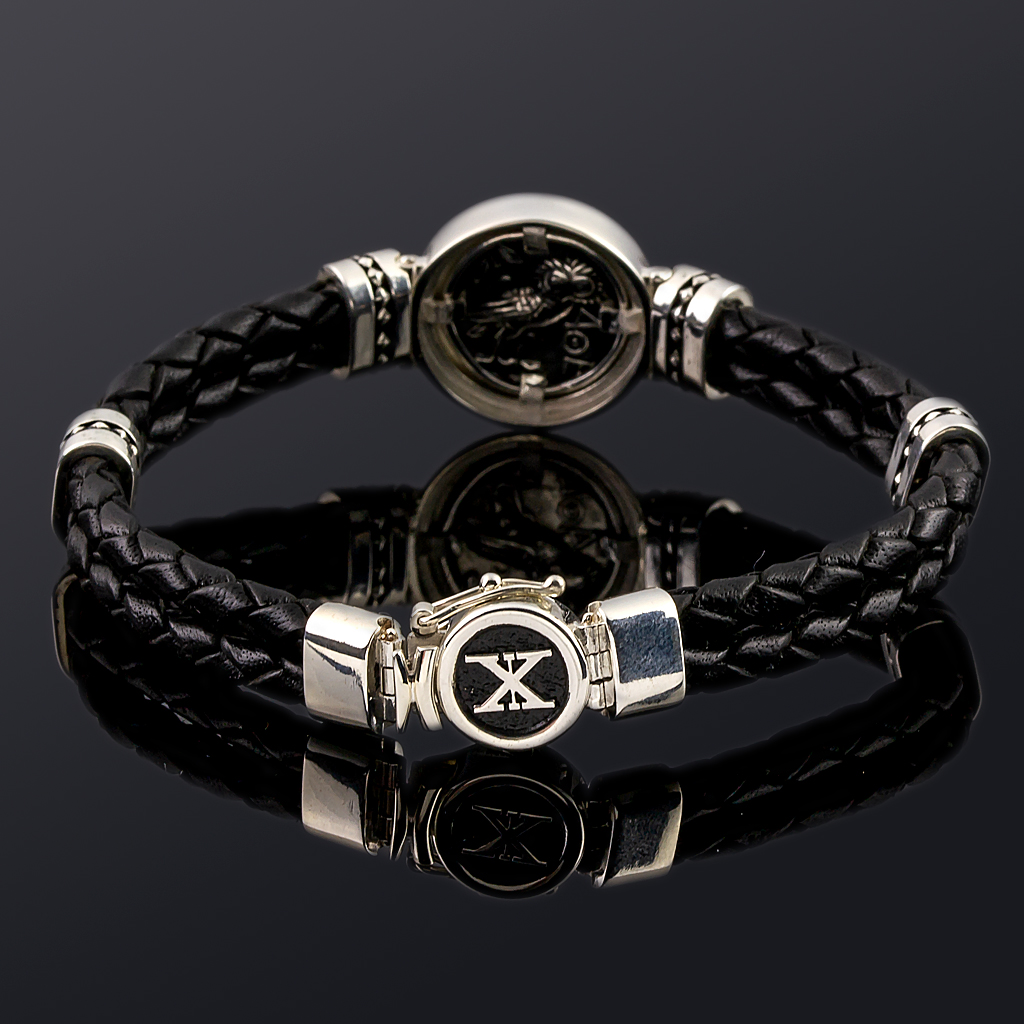 Ασημένιο Βραχιόλι 925° με μοτίβο νόμισμα Αθηνά 16mm και γνήσιο μαύρο δέρμα 4mm