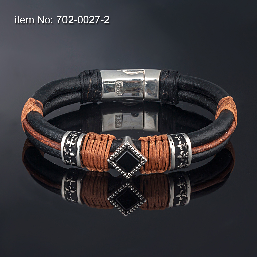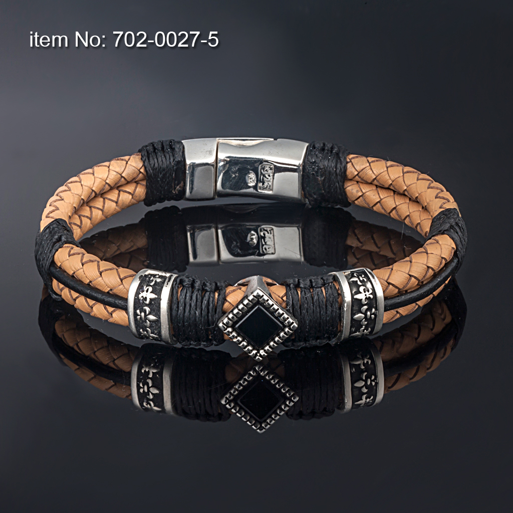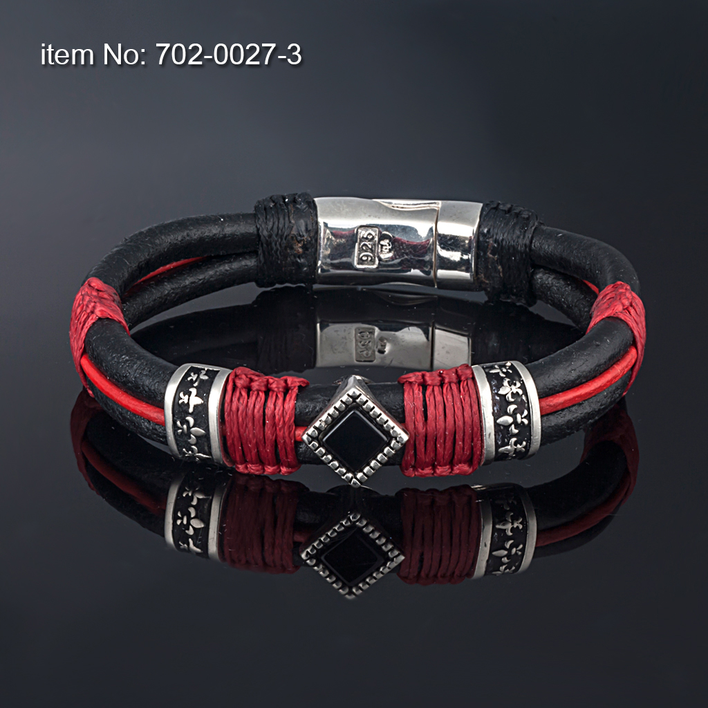 Sterling Silver Bracelet, with Square Black Onyx Center, Surrounded by Two Fleur-de-lis Bands