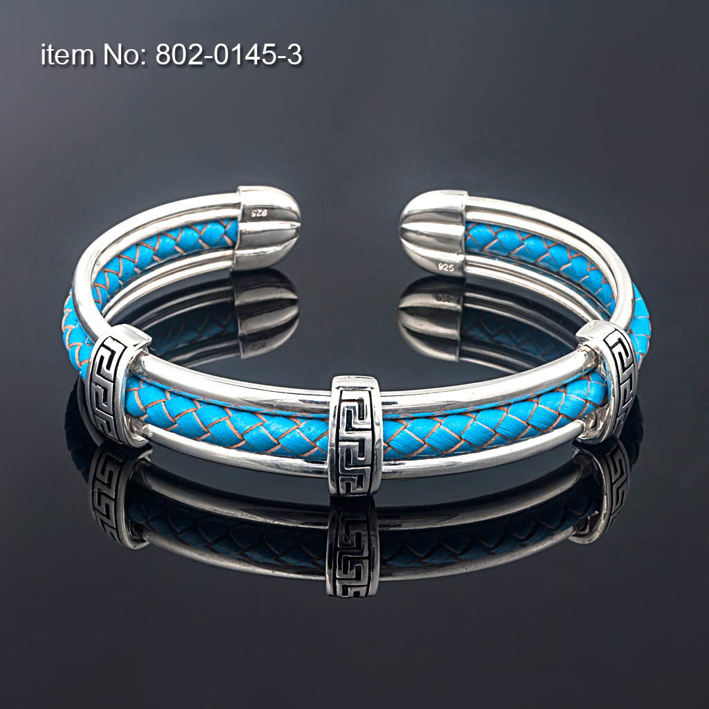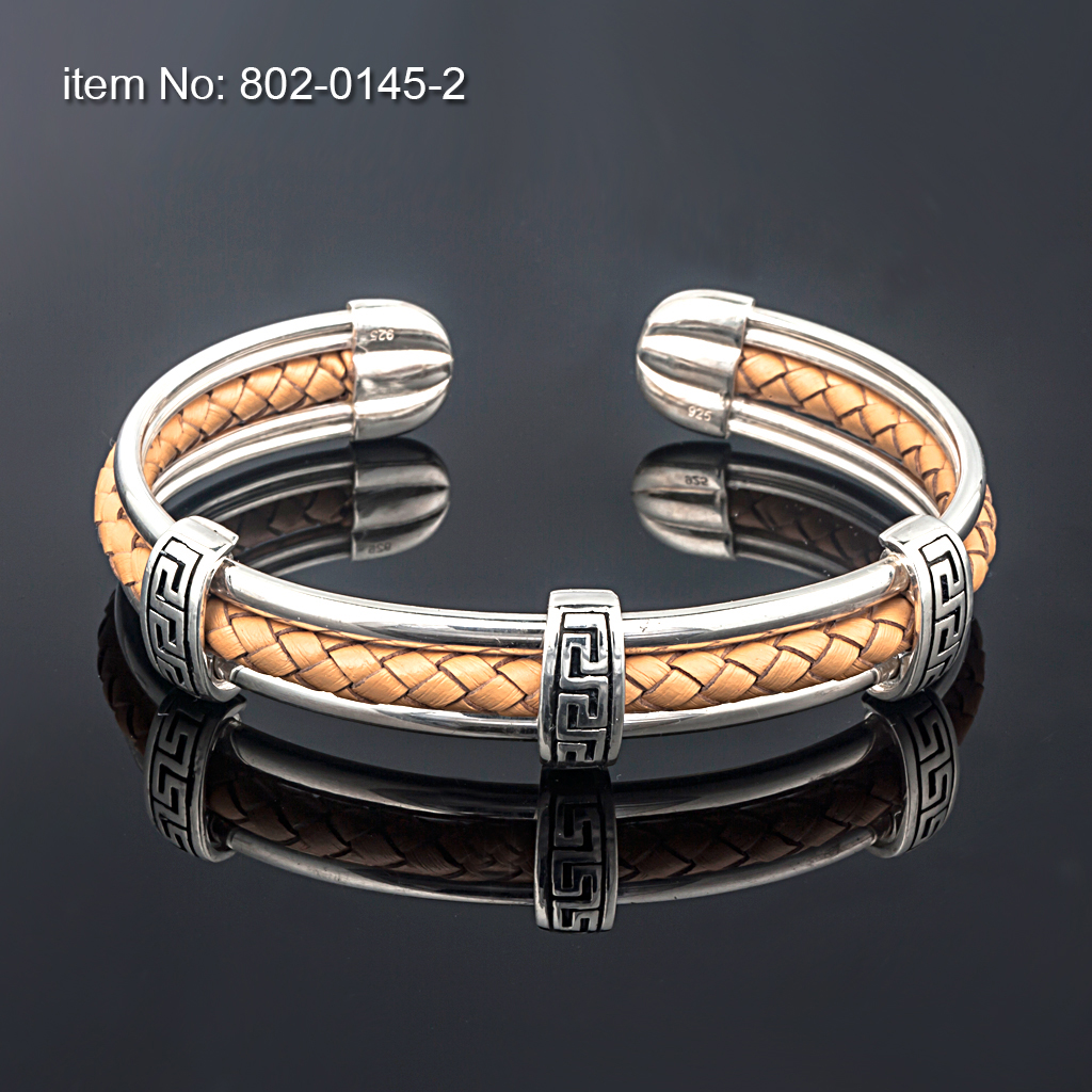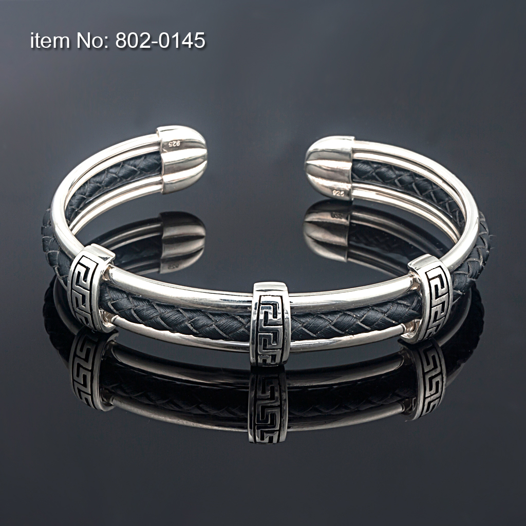 Greek Key Sterling Silver flexible Bracelet Greek Key Sterling Silver flexible Bracelet On genuine leather (colors as shown in pictures) For Men or Ladies Hand crafted in Greeceby AXION JEWELRY DESIGN