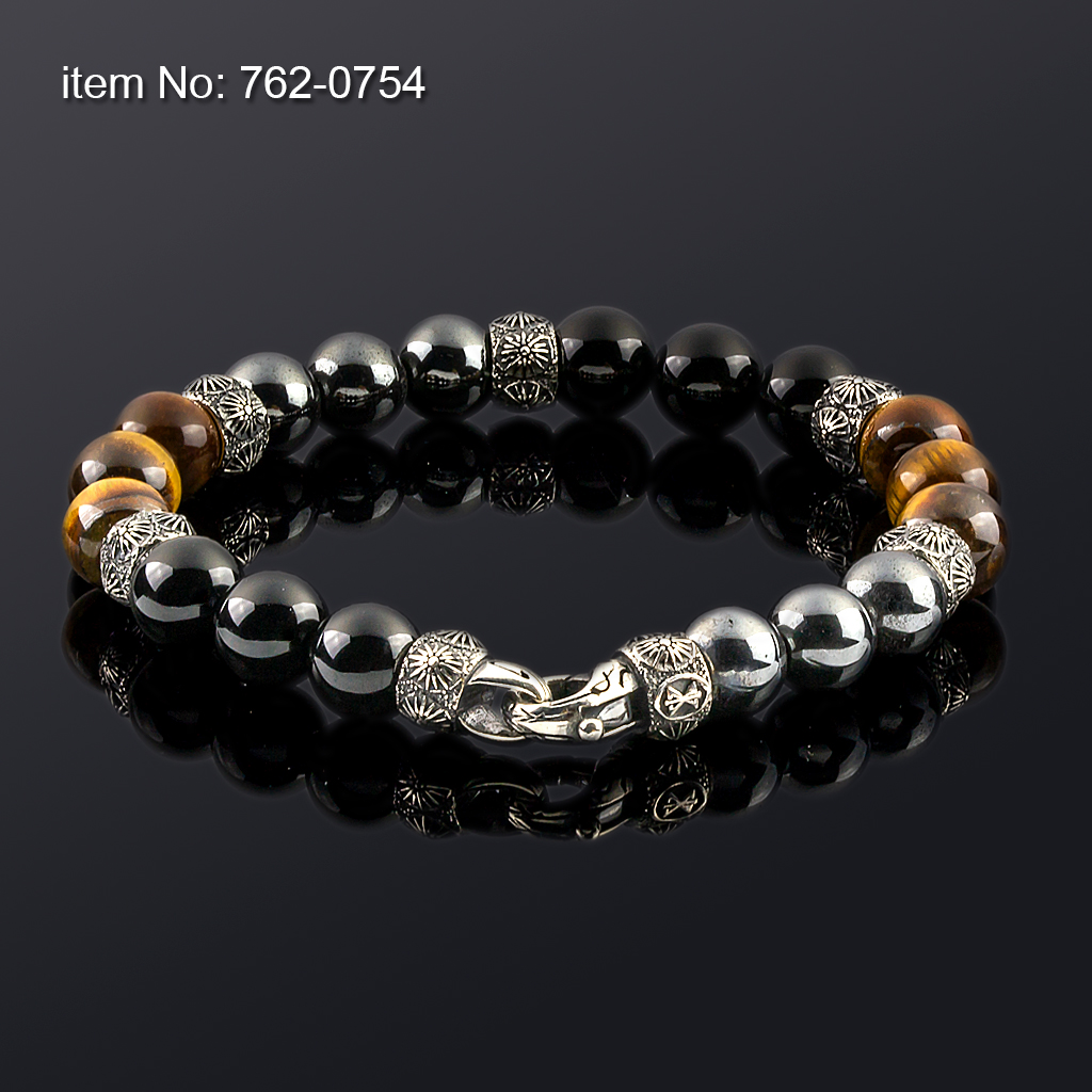 Ασημένιο Βραχιόλι 925° με μοτίφ vergina sun και χάντρες από όνυχα, αιματίτη και μάτι της τίγρης 10mm