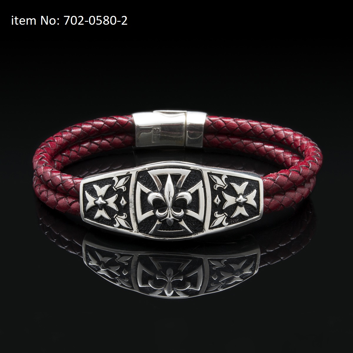 Sterling silver bracelet with Fleurs de lis and crosses motifs. Genuine braided leather