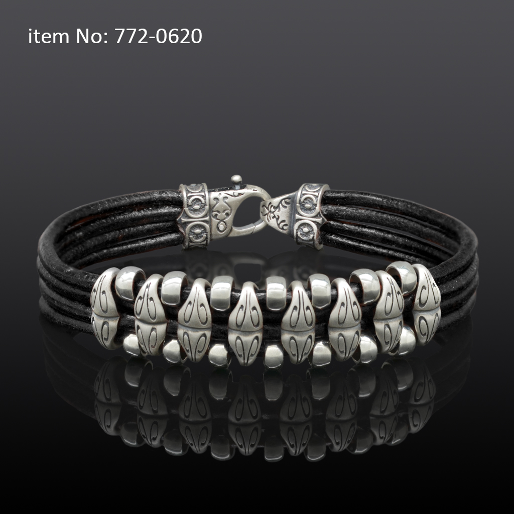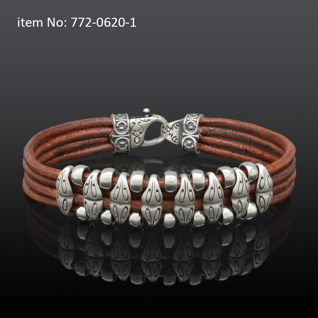 Ασημένιο βραχιόλι 925° με ροδέλες με μοτίφ και γνήσιο κόκκινο πλεκτό τετραπλό δέρμα