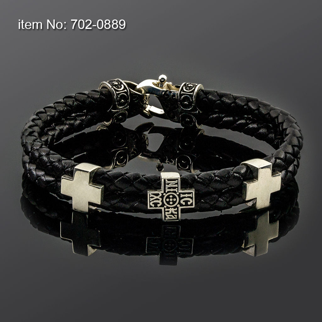 Ασημένιο βραχιόλι με μοτίφ Σταυρούς και με γνήσιο πλεκτό δέρμα