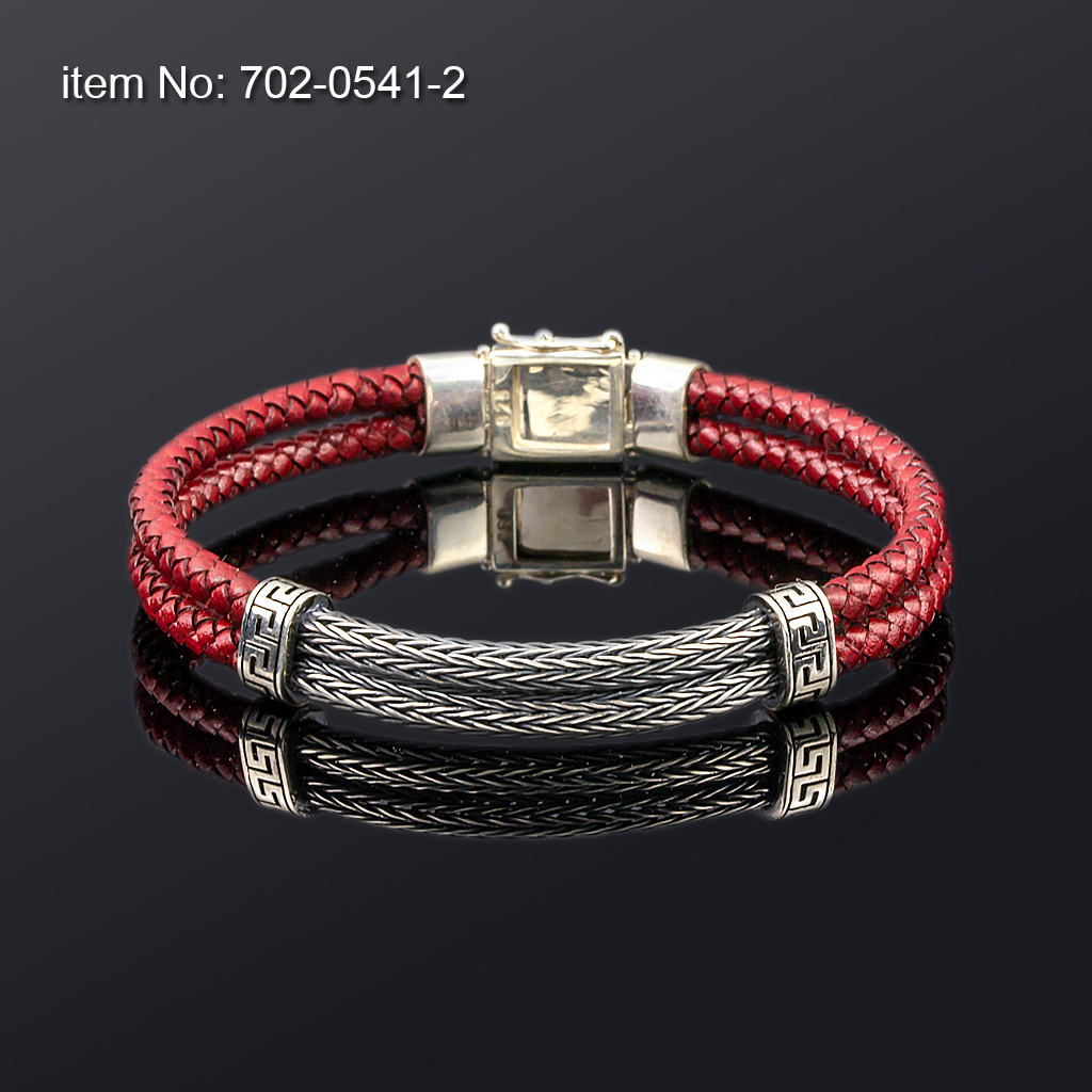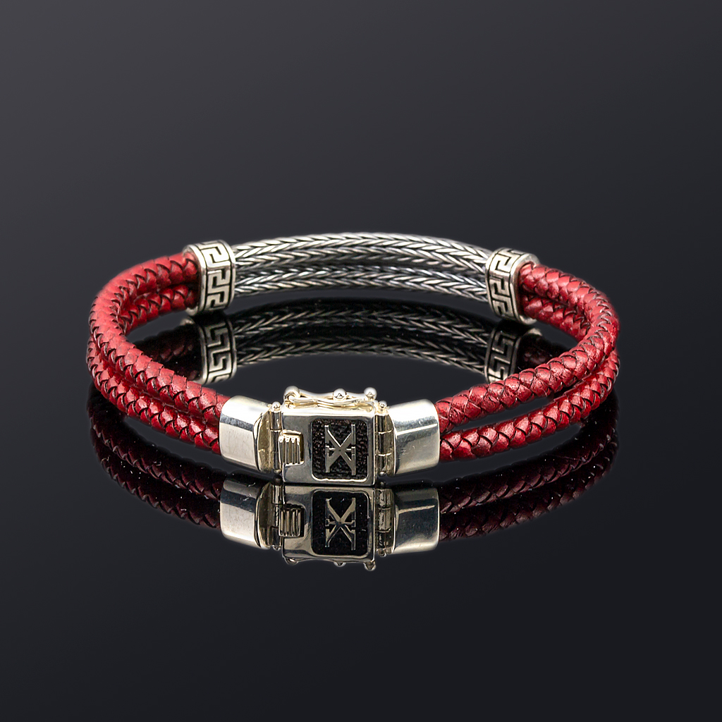 Ασημένιο βραχιόλι με μοτίφ μαιάνδρους, διπλή πλεχτή αλυσίδα και διπλό γνήσιο πλεχτό καφέ δέρμα