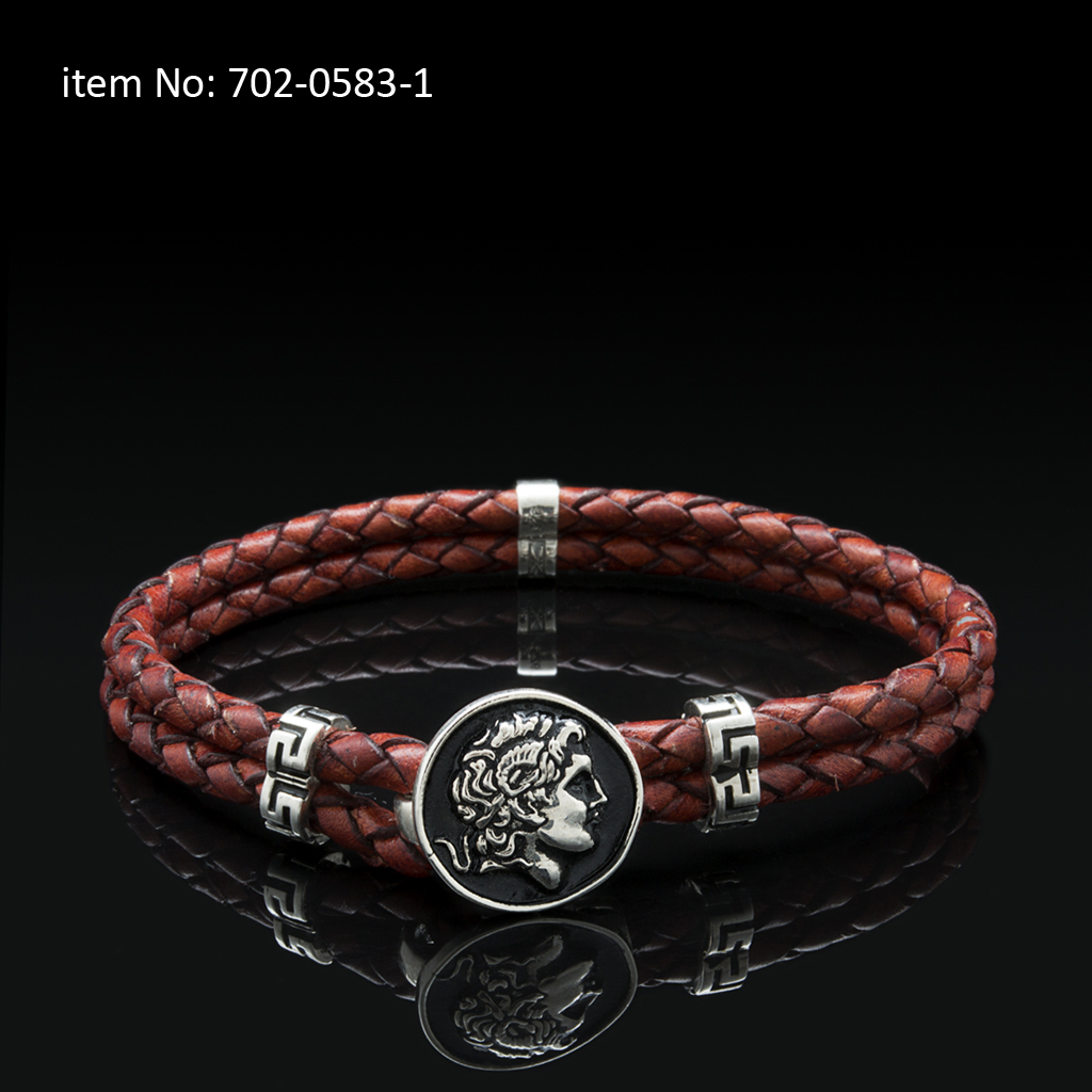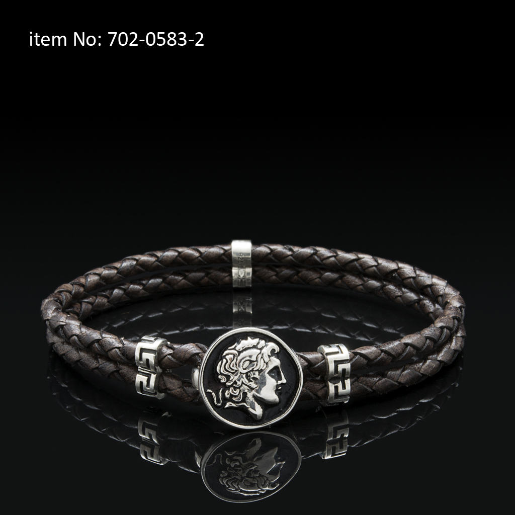 Sterling silver bracelet with Alexander the Great motif and meanders. Genuine braided leather - Click here for more colors -